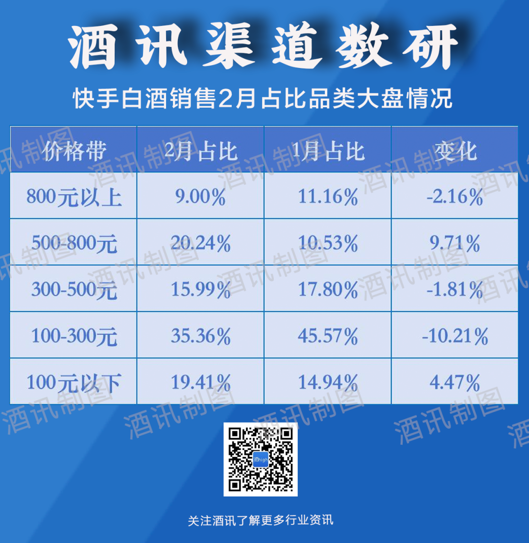 与1月相比,2月500-800元价位带白酒销售大幅上涨9.71个百分点,除此之外,100元以下价位带也有4.47个百分点的上涨;而100-300元价位带占比则下滑10.21个百分点。