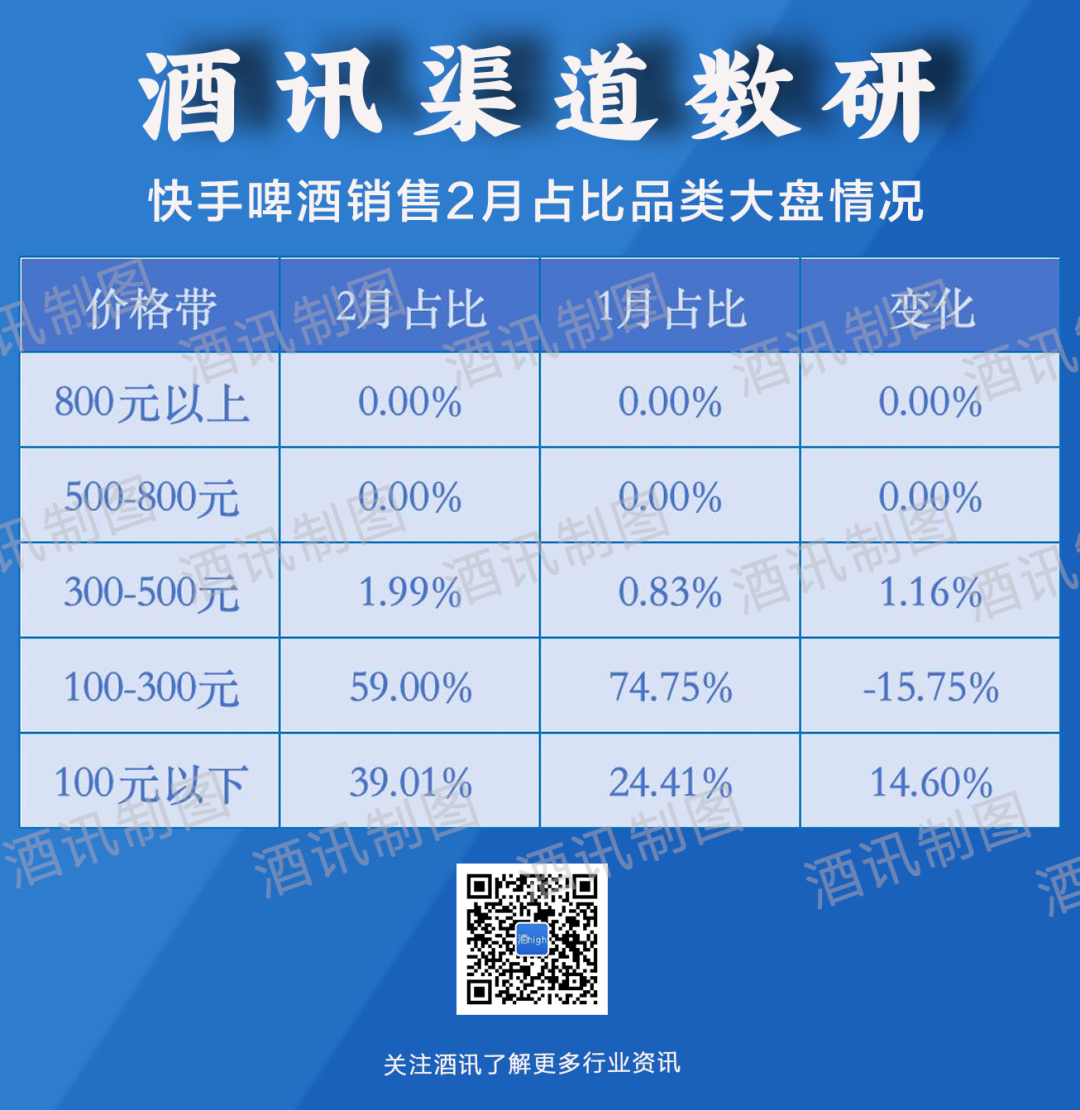 不过,在单品爆款的另一面,啤酒品类的整体客单价却在回调。数据显示,2月快手啤酒销售中,300-500元、100-300元、100元以下各价位带啤酒销售分别占品类1.99%、59.00%、39.01%。其中,100-300元价位带占比下降15.75个百分点,而100元以下价位带则上涨14.60个百分点。可见,随着春节礼赠需求的释放完毕,啤酒消费正在回归日常自饮的基本盘。