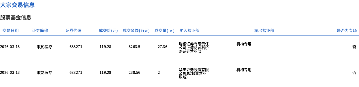 3月13日,联影医疗大宗交易成交29.36万股,成交额3502.06万元,占当日总成交额的4.64%,成交价119.28元,较市场收盘价119.28元持平。