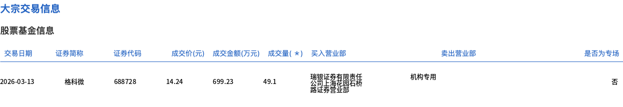 3月13日,格科微大宗交易成交119.55万股,成交额1702.39万元,占当日总成交额的6.07%,成交价14.24元,较市场收盘价14.24元持平。