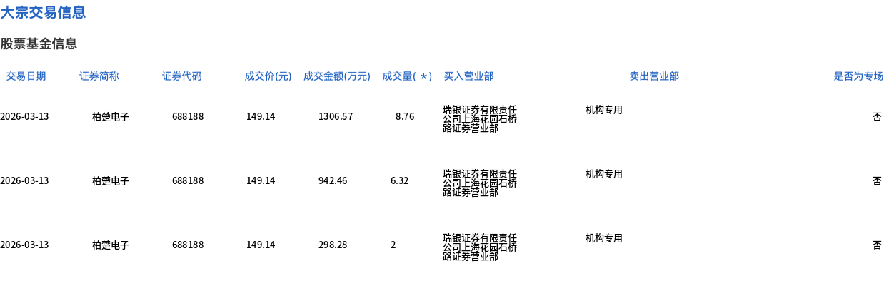 3月13日,柏楚电子大宗交易成交17.08万股,成交额2547.31万元,占当日总成交额的6.53%,成交价149.14元,较市场收盘价149.14元持平。