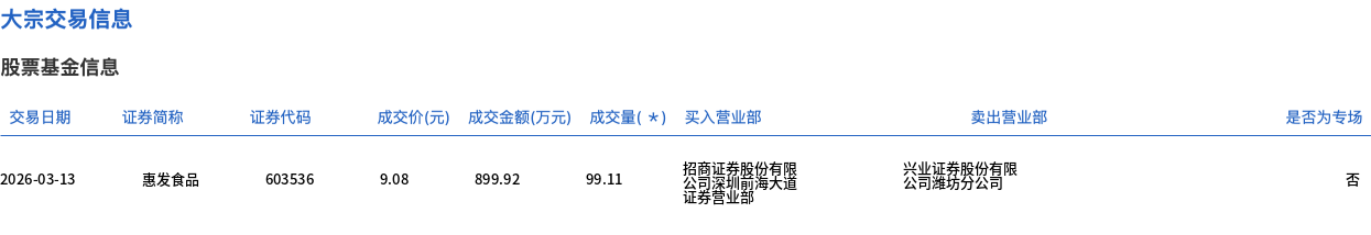 3月13日,惠发食品大宗交易成交99.11万股,成交额899.92万元,占当日总成交额的20.25%,成交价9.08元,较市场收盘价10.08元折价9.92%。