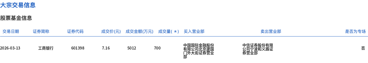 3月13日,工商银行大宗交易成交700万股,成交额5012万元,占当日总成交额的2.25%,成交价7.16元,较市场收盘价7.2元折价0.56%。