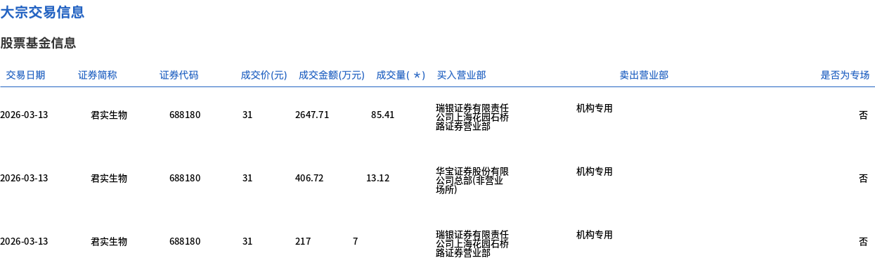 3月13日,君实生物大宗交易成交105.53万股,成交额3271.43万元,占当日总成交额的4.48%,成交价31元,较市场收盘价31元持平。
