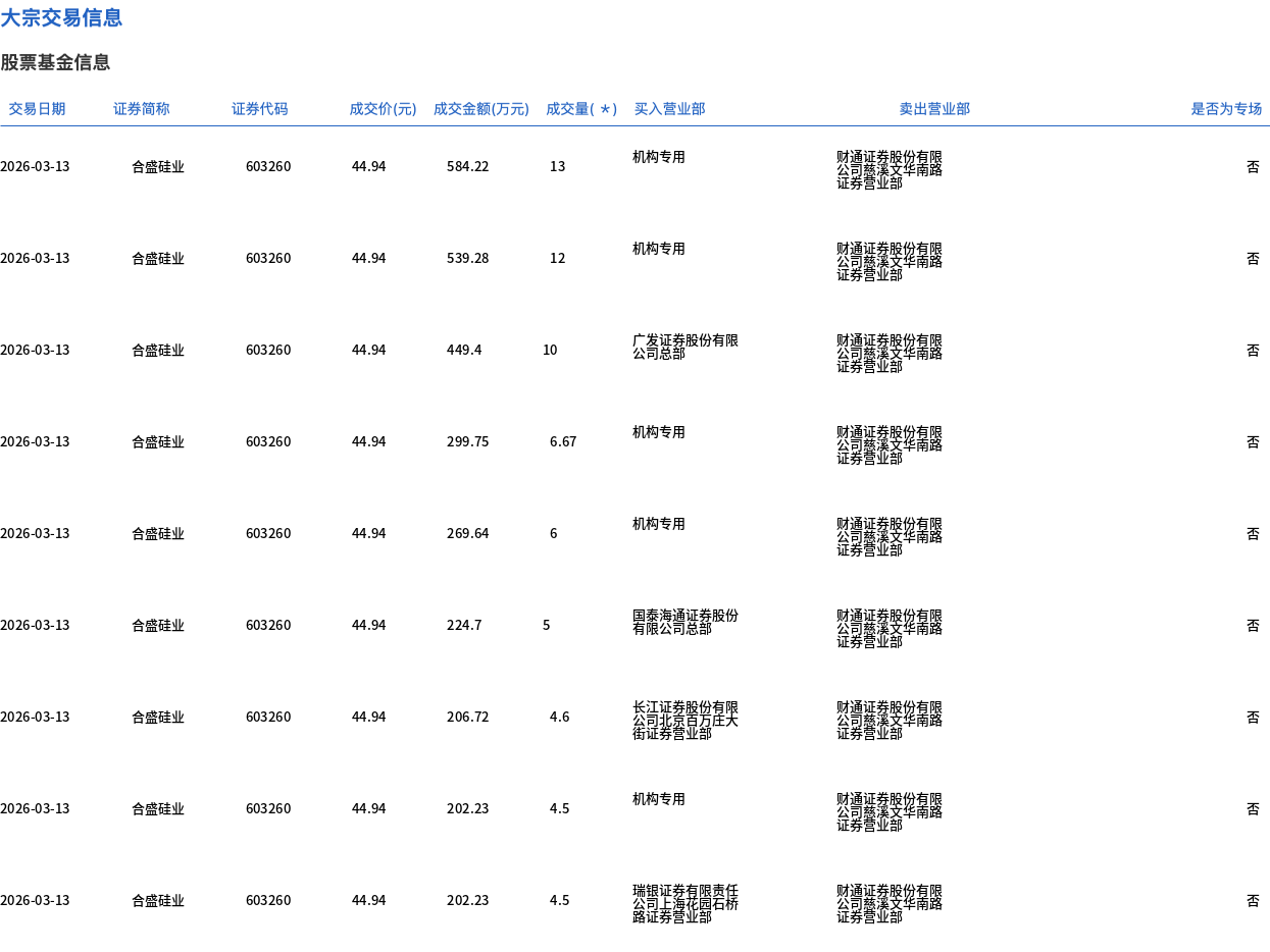 3月13日,合盛硅业大宗交易成交66.27万股,成交额2978.17万元,占当日总成交额的5.59%,成交价44.94元,较市场收盘价49.03元折价8.34%。