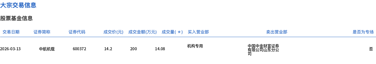 中航机载今日大宗交易平价成交14.08万股,成交额200万元