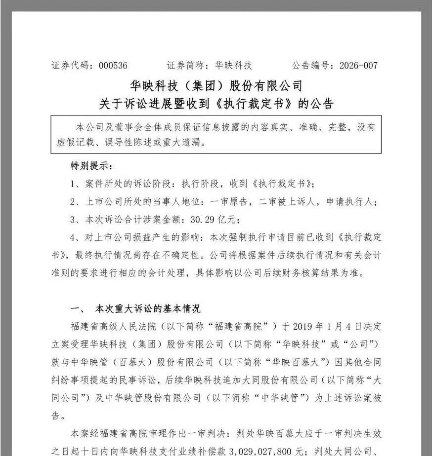 去年12月12日晚间,华映科技发布关于诉讼进展暨终审胜诉的公告,这件拉锯6年的案子终于结案。12日下午,公司收到最高院发出的《中华人民共和国最高人民法院民事判决书(2024)最高法民终86号》,判决结果如下:驳回上诉,维持原判。而一审判决判处华映百慕大应于一审判决生效之日起十日内向华映科技支付业绩补偿款3,029,027,800元。一审案件受理费15,186,939元,司法鉴定费用2,650,700元、财产保全费5,000元,由华映百慕大、大同公司、中华映管共同负担。二审案件受理费15,186,939元,由大同股份有限公司负担。本判决为终审判决。
