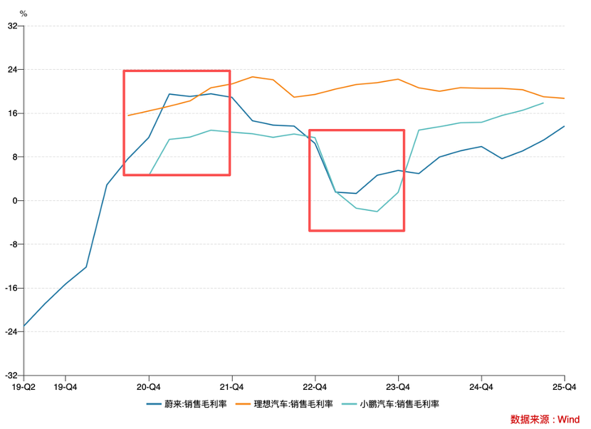 与此同时我们也注意到2025年之后,理想毛利率开始展现出下行的趋势,与此同时小鹏和蔚来的毛利率又在持续改善中,上图中三条折线开始靠拢。