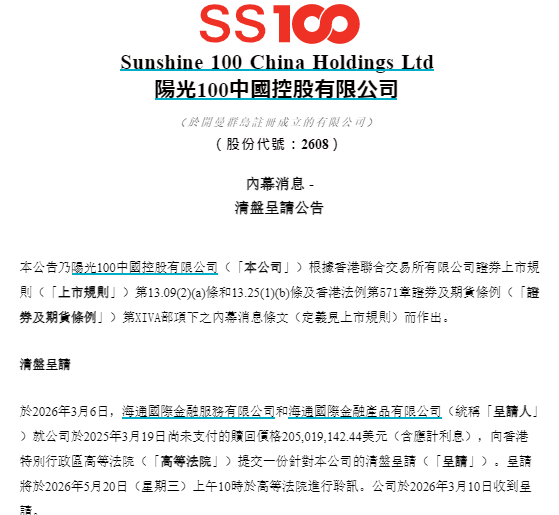 3月12日,阳光100发布公告称,因公司未能按期支付一笔2025年3月到期的2.05亿美元债务,债权人海通国际已向香港高等法院提交清盘呈请,聆讯定于5月20日举行。