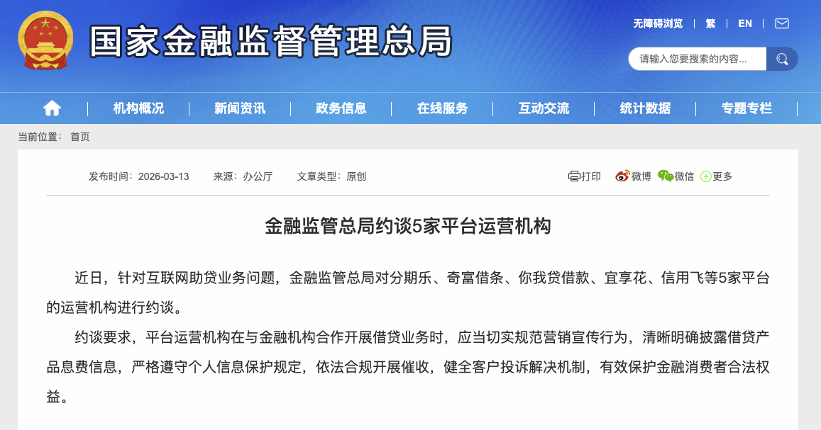3月13日,据金融监管总局网站,近日,针对互联网助贷业务问题,金融监管总局对分期乐、奇富借条、你我贷借款、宜享花、信用飞等5家平台的运营机构进行约谈。