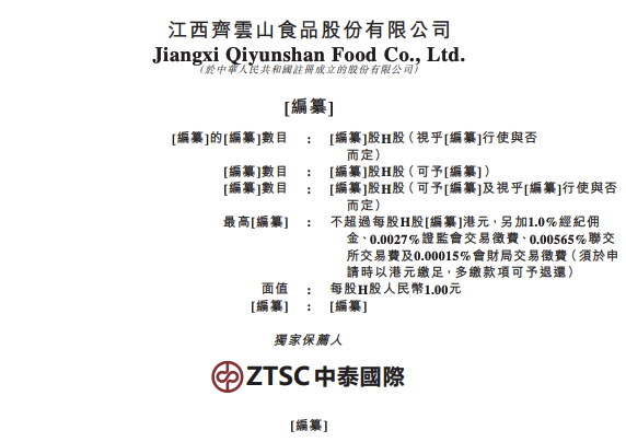 据港交所文件,3月13日,江西齐云山食品股份有限公司向港交所提交上市申请,独家保荐人为中泰国际。