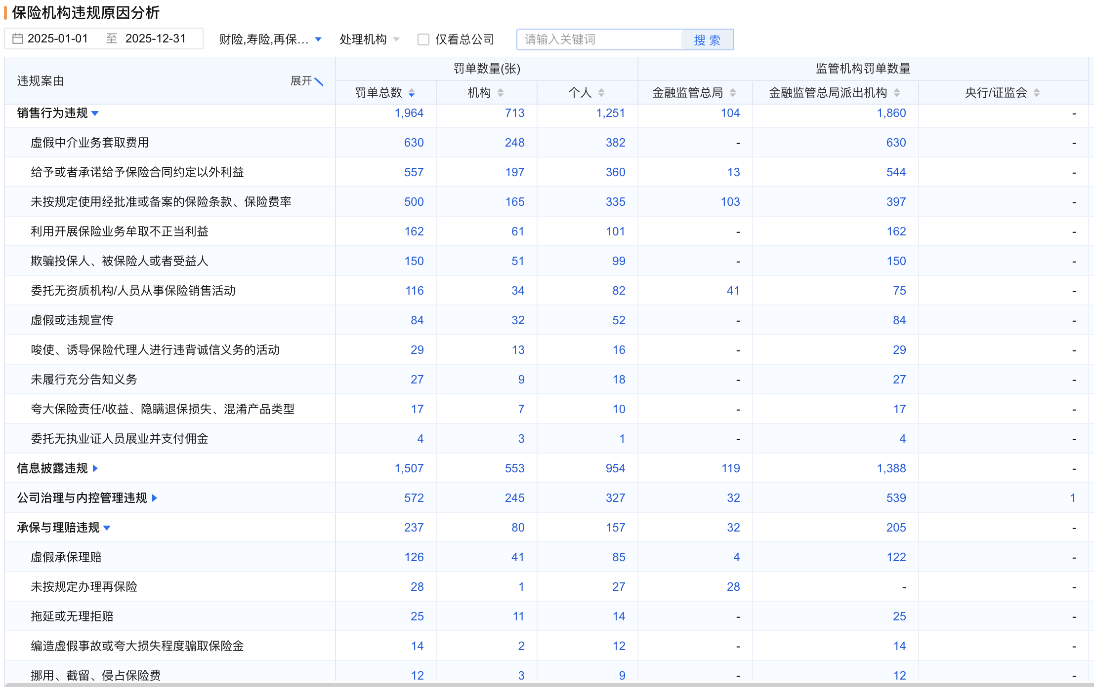 细分来看,2025年,销售行为违规的相关罚单数量为1964,占比达到41.86%。2024年这一数据为40.25%。2025年,这一占比提升1.61个百分点,罚单数量增加162张。