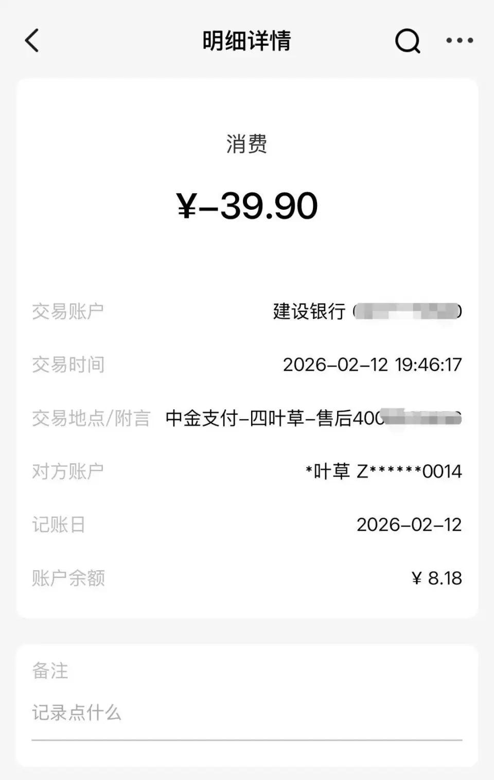 这几笔扣款,同样在小莫的微信和支付宝上找不到,只出现在银行卡的扣款记录中,手机上交易信息显示为“中金支付——四叶草”。