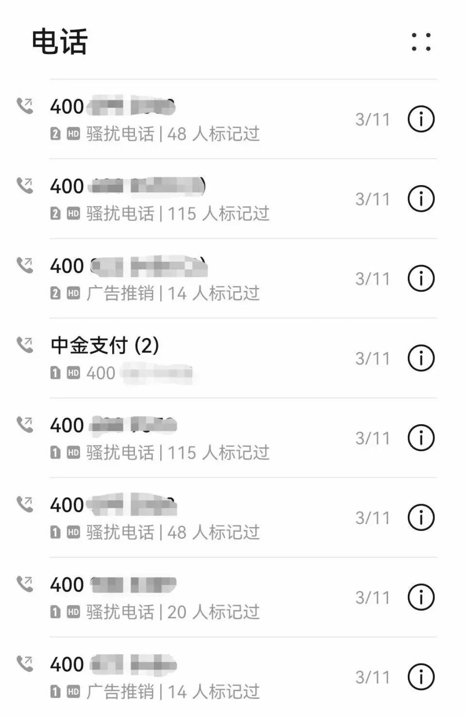 令人意外的是,拨通这些“官方客服电话”后,手机通话界面竟全部显示为骚扰电话或广告营销电话,这意味着,这些号码已被很多用户打过标签。接通后,一个AI客服的声音迅速响起,话术如出一辙:“关于退款问题请按1。”