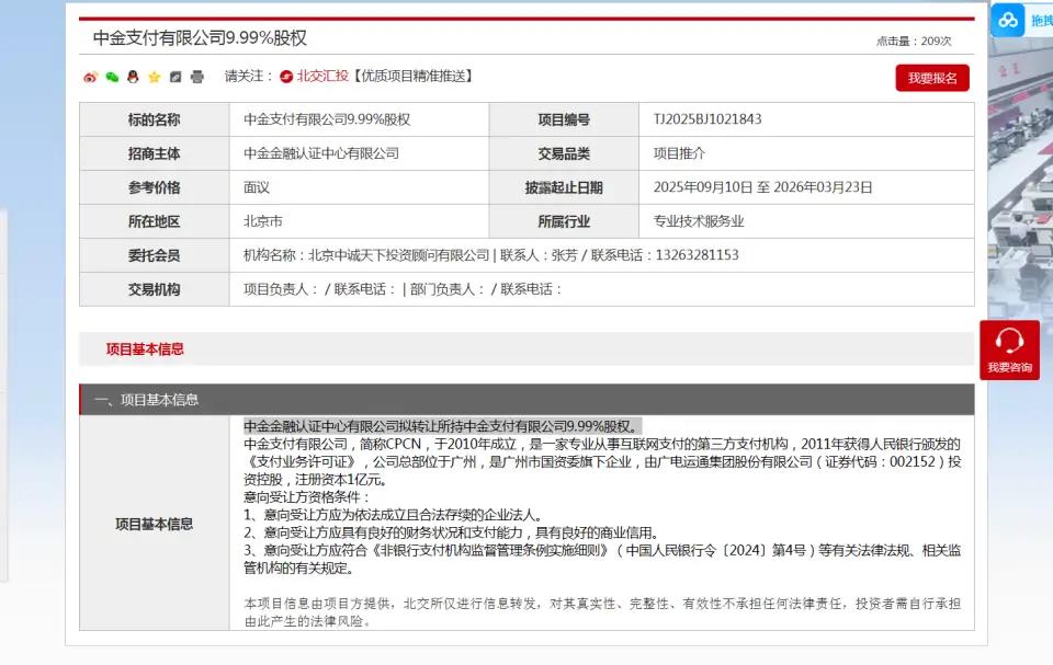 除了面临用户的“信任危机”,中金支付也正在退出银联系。2025年12月25日,北京产权交易所正式披露,中金支付有限公司的第二股东中金金融认证中心有限公司(简称“CFCA”)将其9.99%股权挂牌转让,转让底价为2570万元。