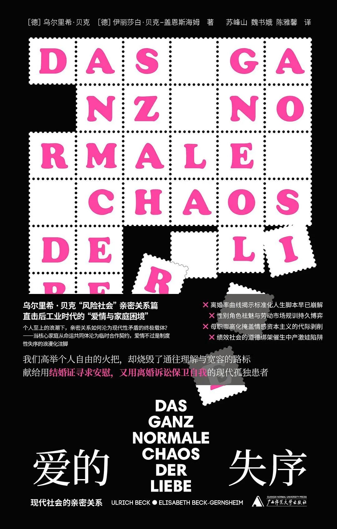 在《爱的失序:现代社会的亲密关系》中,德国著名社会学家夫妇乌尔里希·贝克与伊丽莎白·贝克-盖恩斯海姆,用数据及案例深刻揭示了当代亲密关系的残酷真相:我们正被困在“个体化”的迷宫中,女性挣脱“持家者”的枷锁,男性恐惧失去“养家者”的荣光,传统的性别契约正在崩塌,而新的规则尚未诞生。