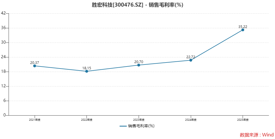 与此同时,胜宏科技去年整体销售毛利率为35.22%,同比增加了12个百分点。HDI拉动最明显,毛利率从2024年的22.5%上升至去年前三季度的45%。
