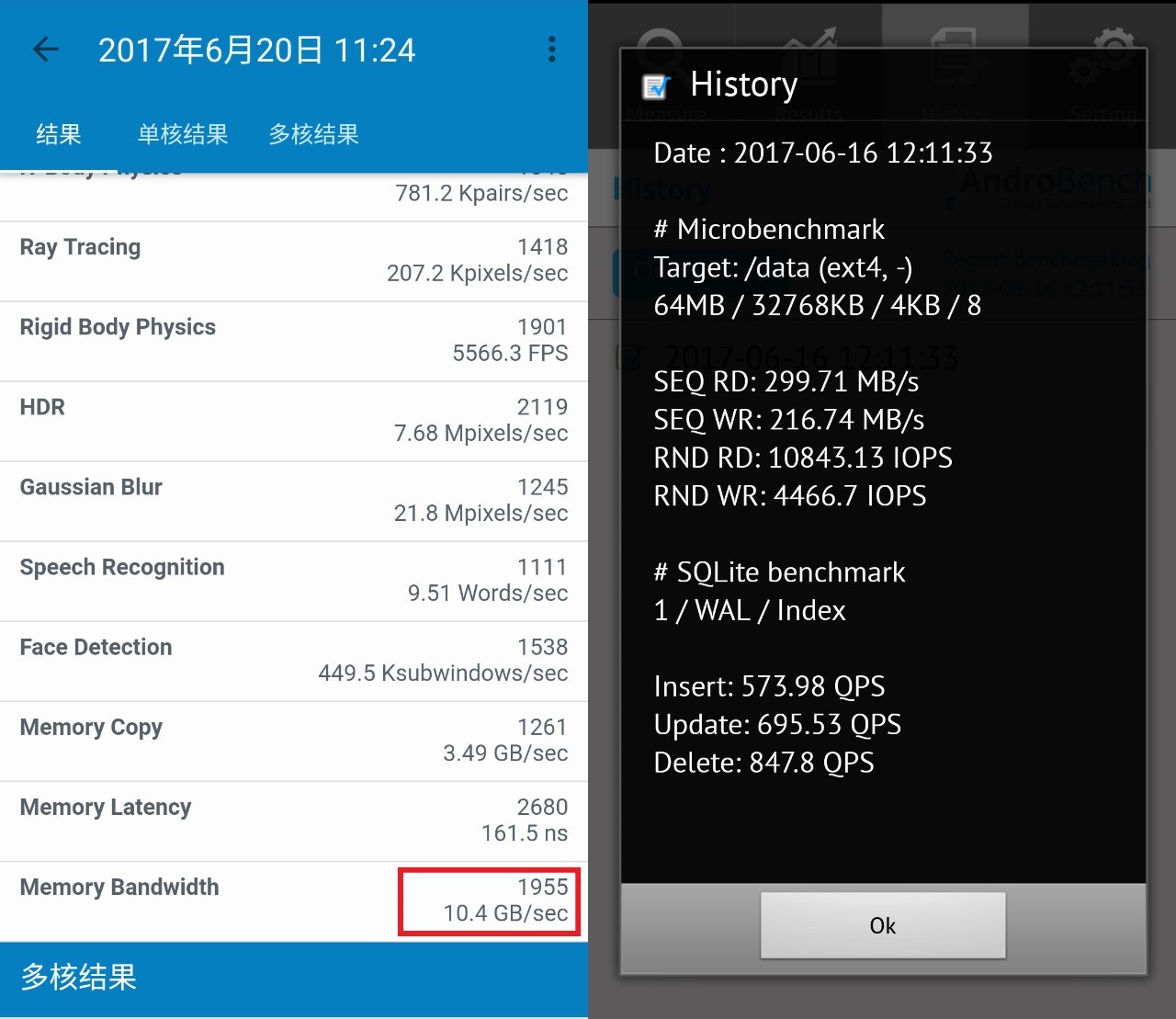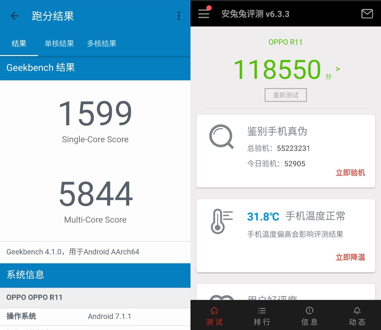 配置方面,OPPO R11搭载了高通最新中端处理器骁龙660,这颗SOC为14nm LPP制程,自主八核心架构,4个高频大核为2.2GHz,4个低频小核为1.8GHz,GPU是Adreno 512,对比骁龙653,在性能上提高了20%,图形处理能力提升30%。OPPO R11运行内存为4GB,R11 Plus则是6GB,辅以64GB闪存,支持最高128GB扩展,通过软件测试,并非UFS,而是eMMC。简单跑个分,安兔兔成绩118550分,GeekBench单核1599分,多核5844分,3DMark1348分。从数据来看,跟高通官方描述差别不大,较骁龙653确实有明显提升。然而,骁龙660虽有突破,但距骁龙835仍有不小的差距,本来它是支持UFS和LPDDR4标准的,但从实测结果来看,R11的闪存为eMMC,运行内存带宽(10GB/S)左右,从数值看的话,属于LPDDR3的水准,当然这个我们无法像闪存一样下定论,只能给大家提供一个数据作为参考。