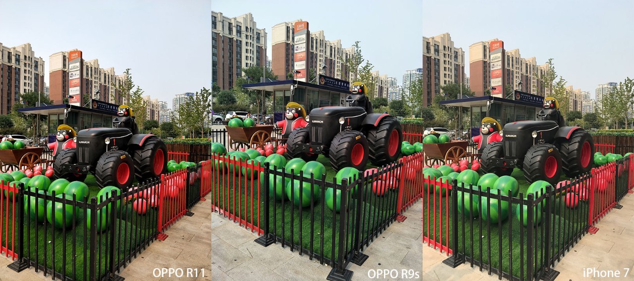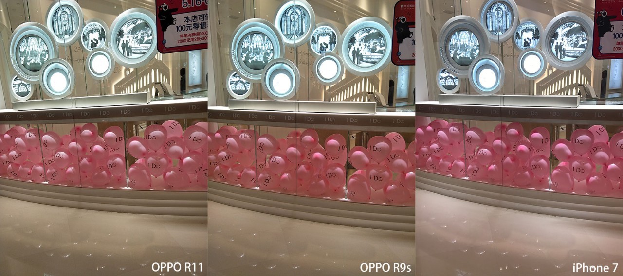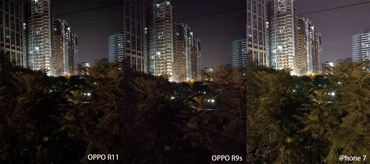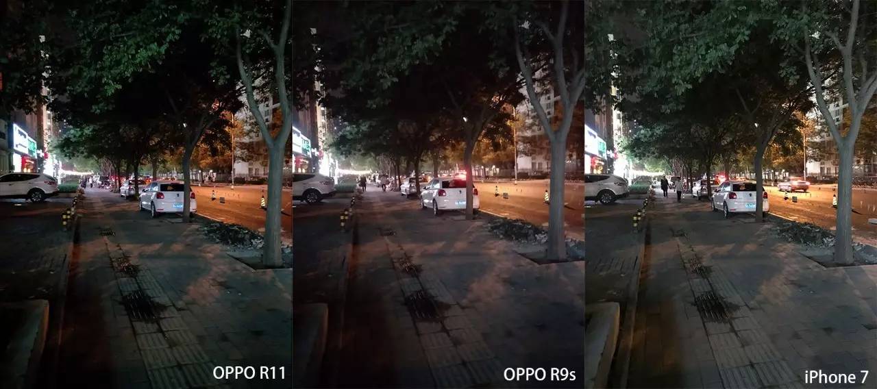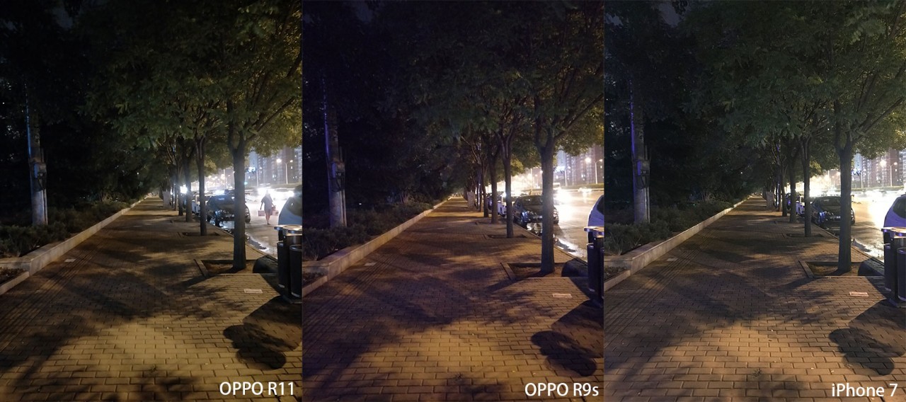 在光线较昏暗的情况下,可以明显看到,OPPO R11白平衡偏黄,而OPPO R9S画风则又偏向了红色,对比实际景物,iPhone 7则稍有些偏蓝偏冷,这是要凑齐三原色的节奏。