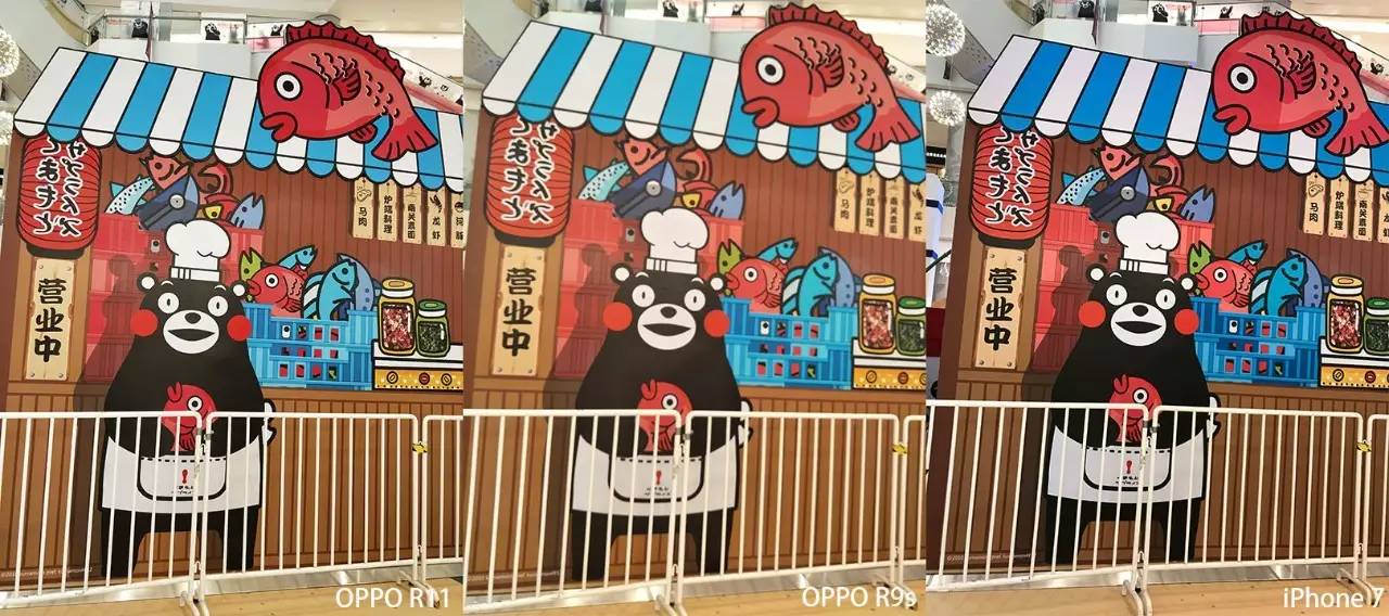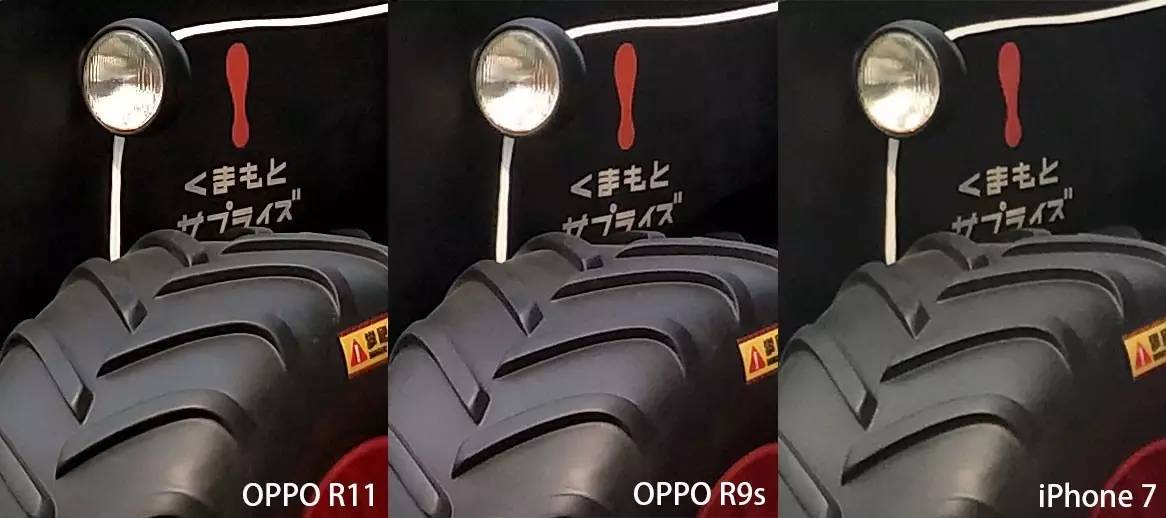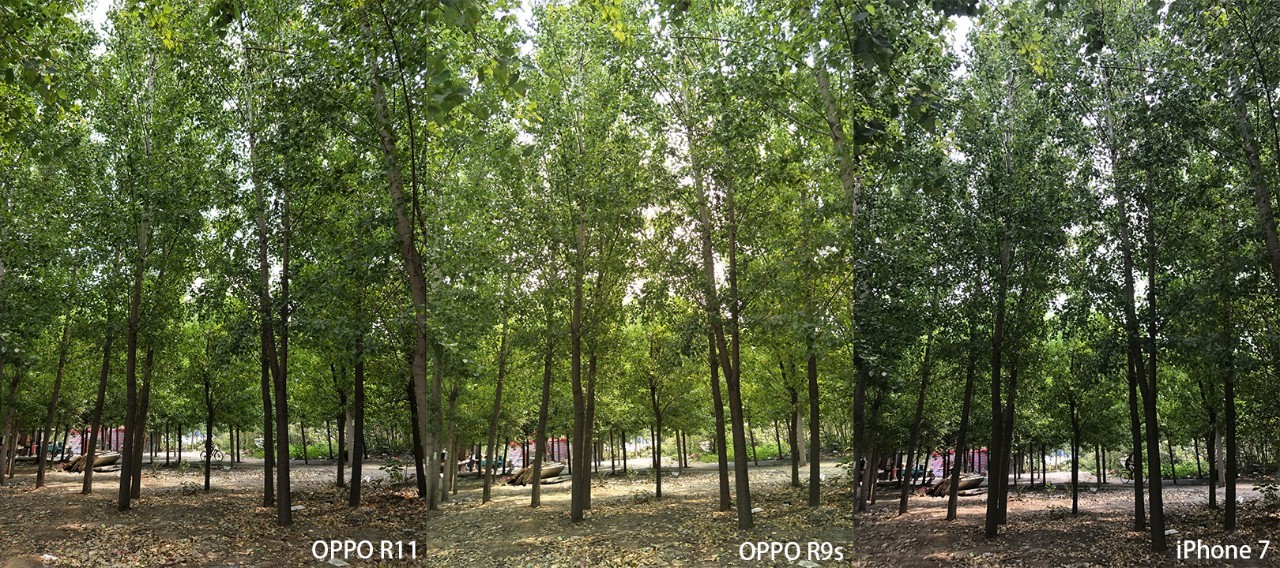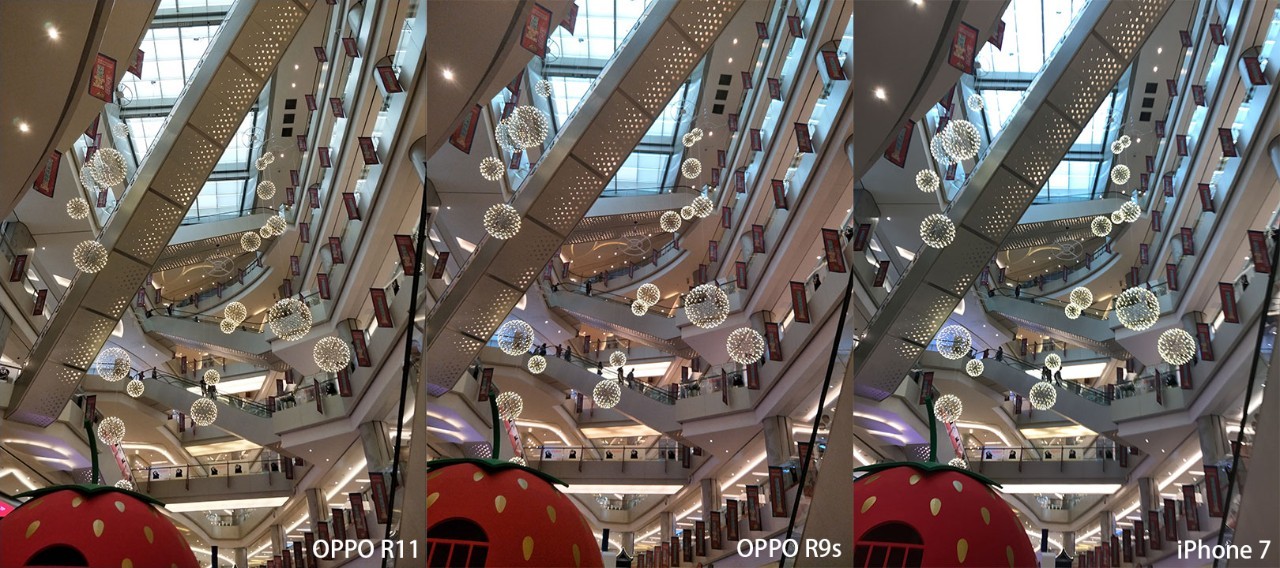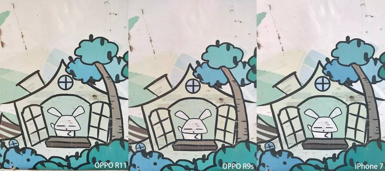在光线较昏暗的情况下,可以明显看到,OPPO R11白平衡偏黄,而OPPO R9S画风则又偏向了红色,对比实际景物,iPhone 7则稍有些偏蓝偏冷,这是要凑齐三原色的节奏。