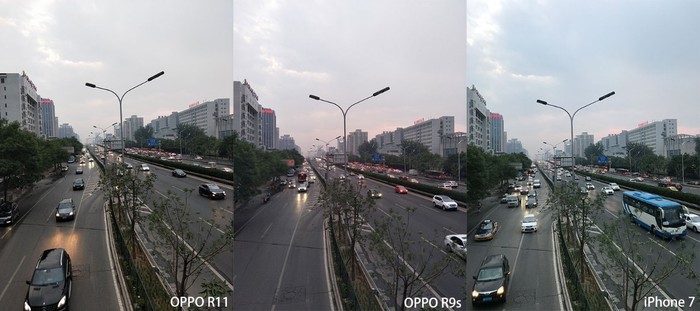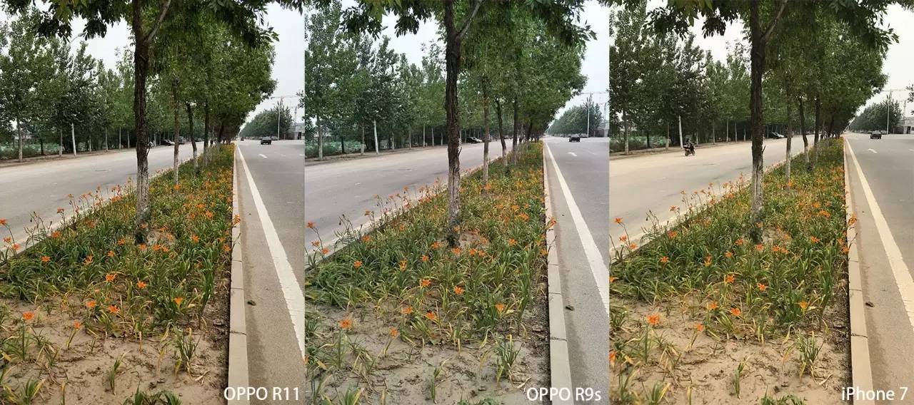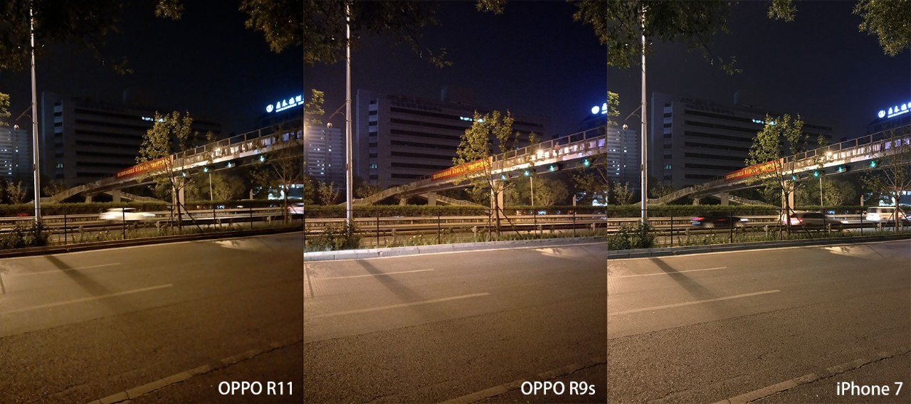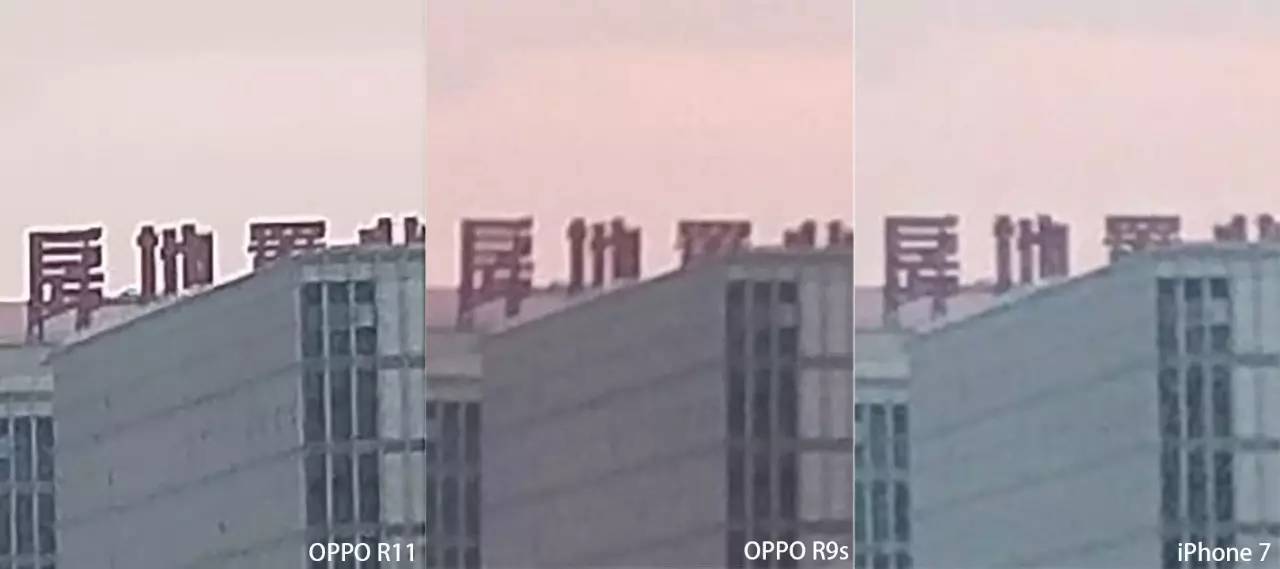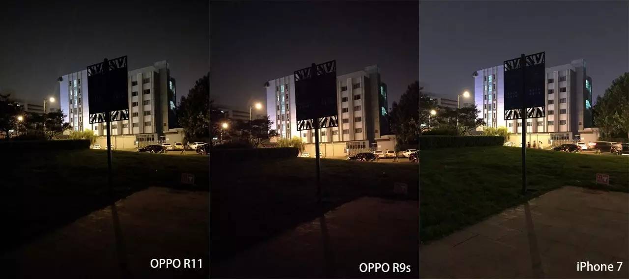 同样是在夜晚,R11白天的解析力优势却没有了,远处建筑物已经有些模糊,反而是R9S要好很多,而画面亮度上,跟iPhone 7还是有一定差距。