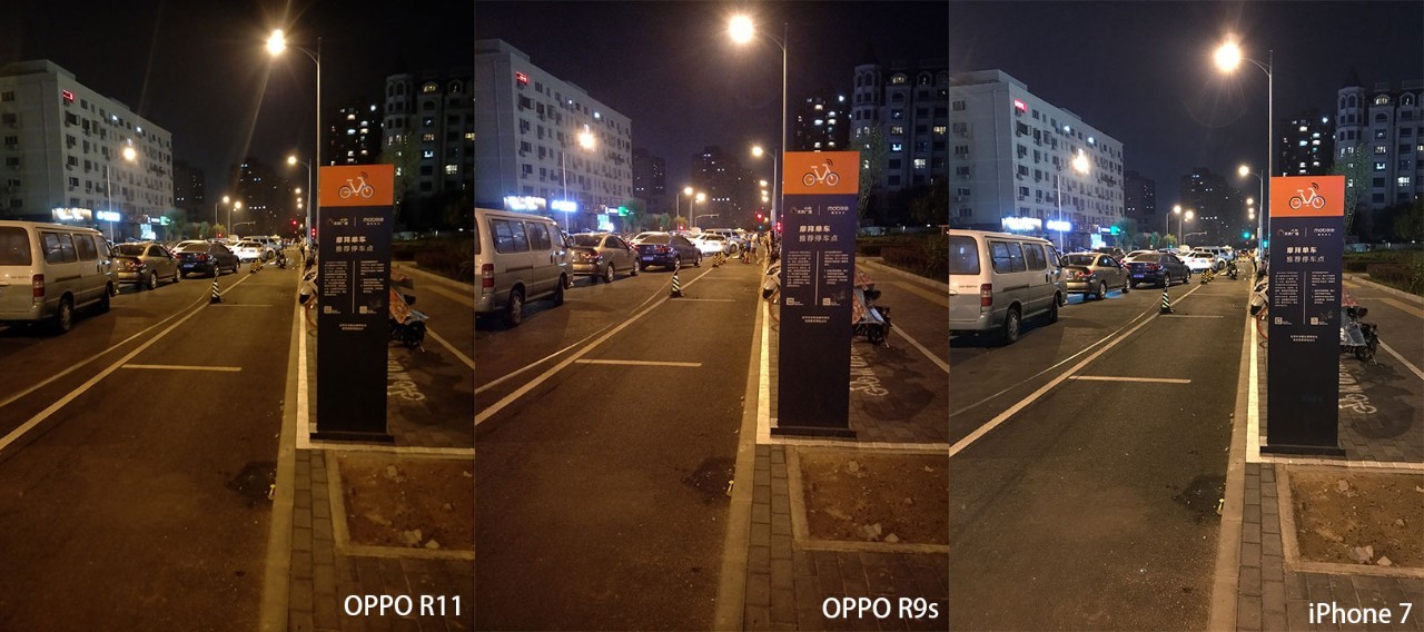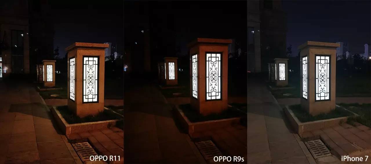 夜间光线不足的情况下,同样,最明显的差别还是白平衡,OPPO R11夜拍依旧偏暖,R9s整体画面则相对较暗,白平衡同样也是偏暖。