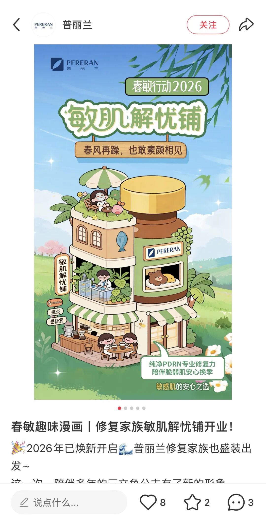 3月11日,进一步明确护肤方案,区分日常维稳与春敏急救需求,其中日常维稳三件套包含小云朵洁面、超修精华霜、舒缓防晒,春敏时期黄金搭档则为自修精华与超修精华霜,形成覆盖全场景的春敏护理体系。