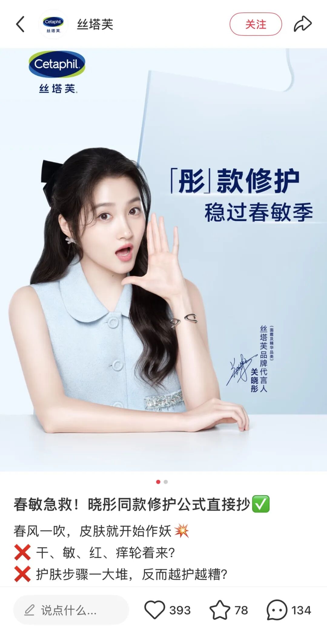2026年2月26日,其正式官宣演员关晓彤为品牌面霜及精华品类代言人,此次代言带动品牌声量显著攀升。在此基础上,丝塔芙围绕春敏场景持续发力: