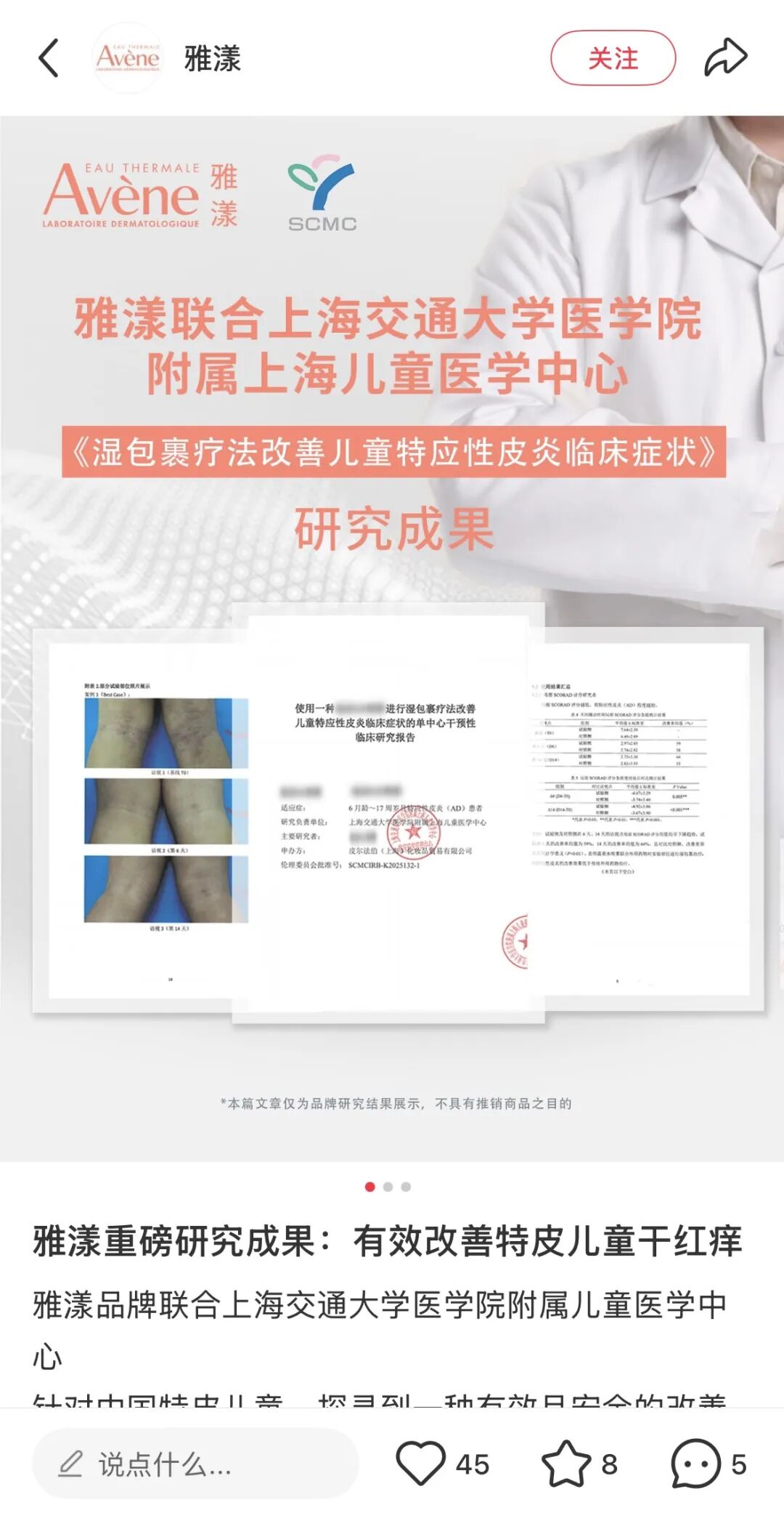 2月12日,雅漾联合上海交通大学医学院附属上海儿童医学中心发布《湿包裹疗法改善儿童特应性皮炎临床症状》研究成果,针对中国特应性皮炎儿童群体,探索出安全且有效的湿包裹护理方案,精准改善肌肤干、红、痒等问题。