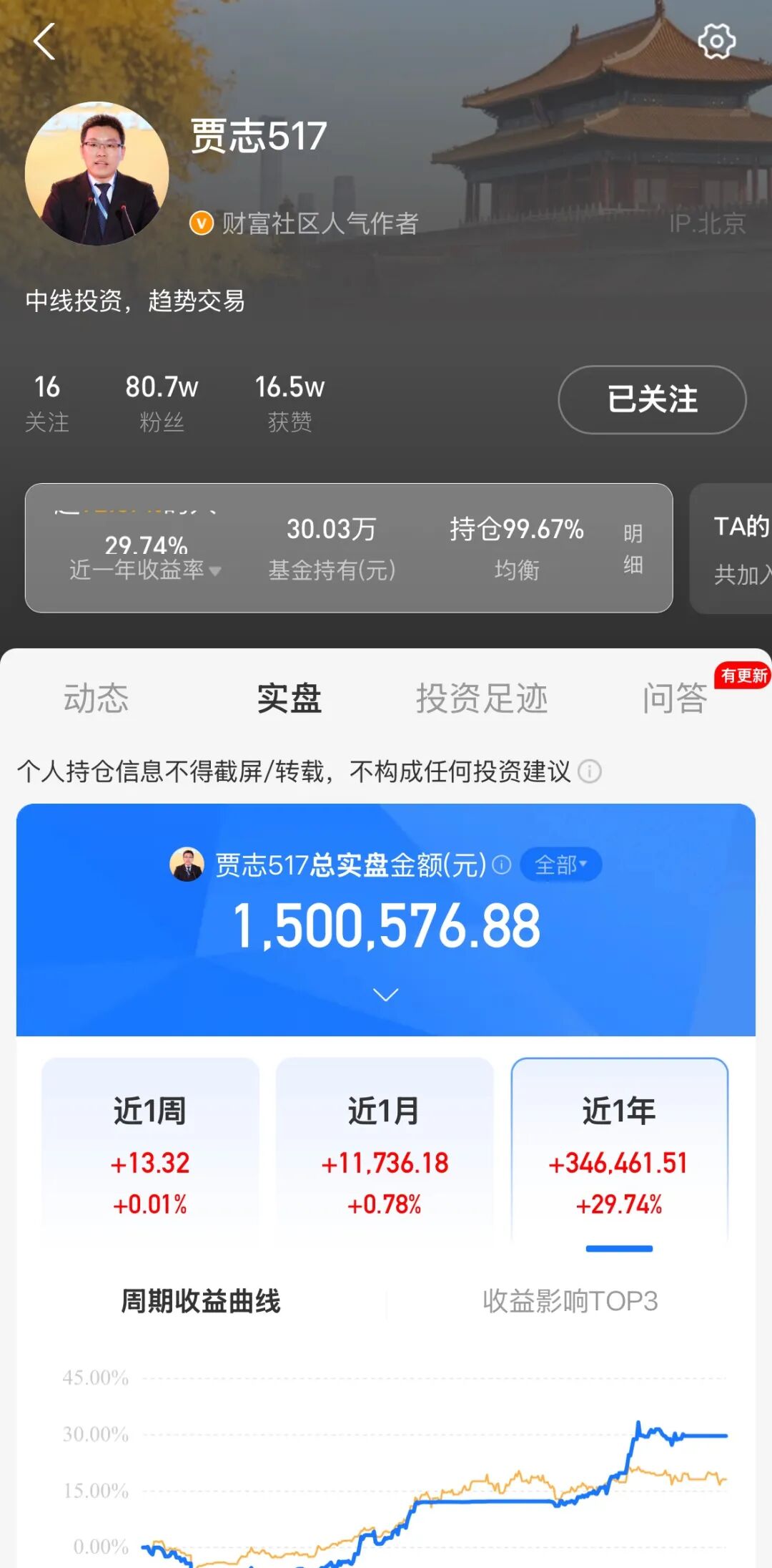 贾志从事过券商研究、FOF投资,并通过稳定的实盘成绩和投教分享,跑赢同期沪深300指数约14个百分点,成为蚂蚁财富社区中少有的实名认证且拥有超过80万粉丝的大V。