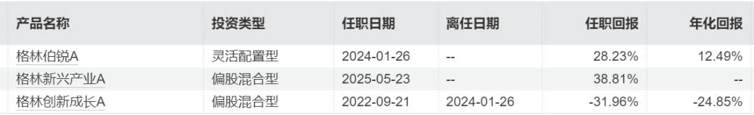另一位基金经理王振林,中国人民大学金融硕士,3.46年基金经理经验,曾任弘康人寿权益投资部股票研究员,2021年加入格林基金,曾任股票研究员、现任基金经理,目前在管2只基金,其中管理格林产业混合A任职回报最高,达38.81%。