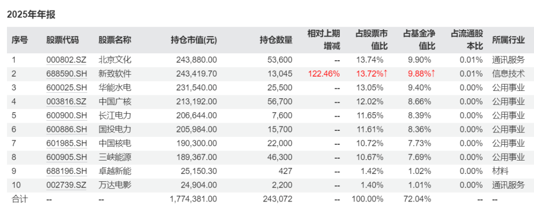 格林新兴产业混合重仓的个股中,与2025年三季度末相比,四季度末仅华致软件连续持有两个季度,其他9只均为新买入的股票。其中,北京文化、华致软件、华能水电3只股票持仓数量占基金净值比均超过9%,中国广核、长江电力、国投电力重仓比例均超过8%,中国核电、三峡能源占持仓占比超过7%、卓越新能、万达电影持仓比例超过1%。2026年一季度重仓的股票将发生哪些变化,独角金融将持续关注。