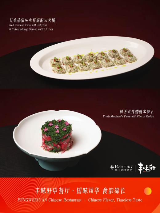 春食当令,鲜字为先。丰味轩中餐厅主厨团队循着春日的脚步,深入田间地头与近海码头,甄选当季最具代表性的时令食材,将春的鲜嫩与胶东的鲜醇完美融合,推出多款春季限定菜品,每一道都藏着春日的馈赠与主厨的匠心。其中,主推鲜荠菜拌樱桃水萝卜,是最具春日气息的清爽小菜。新鲜荠菜带着田间的露珠与清香,焯水后口感脆嫩,搭配清甜多汁的樱桃水萝卜,脆嫩爽口、清甜解腻。简单的凉拌手法,最大程度保留了食材的本真滋味,荠菜的清香与樱桃水萝卜的清甜相互映衬,入口清爽回甘,仿佛能尝到春日田野的清新与温润,唤醒味蕾的同时,也带来满满的春日治愈感。眼下正是荠菜鲜嫩上市的时节,这道小菜也成为食客尝鲜春日的首选之一。红香椿蛰头小豆腐配5J火腿,是春日里最具层次感的开胃珍馐。头茬红香椿色泽紫红、香气浓郁,经焯水去涩后保留最纯粹的春日清香,搭配滑嫩爽口的自制小豆腐,软嫩中带着细微颗粒感;再辅以脆嫩鲜爽的海蛰头,中和了香椿的醇厚,最后点缀5J火腿,咸香回甘,层次丰富。一口下去,香椿的鲜、豆腐的嫩、蛰头的脆、火腿的醇交织碰撞,既有春日野菜的清新,又有海味与火腿的厚重,每一口都是大自然的馈赠,唤醒沉睡一冬的味蕾。