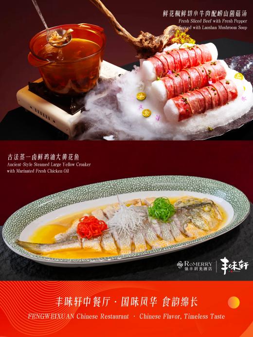 丰味轩中餐厅以“东方雅致,胶东本味”为核心理念,打造兼具美学与烟火气的用餐空间。这里延续新中式设计精髓,一步一景皆藏东方韵味,笔墨书香与雅致光影交织,复现东方美学的温润与灵动。10间独立典雅包间静谧私密,适配商务宴请的尊崇体面,细节处尽显格调;100席雅座开阔通透,承载亲友相聚的温情暖意,烟火气与仪式感兼具。更值得一提的是,餐厅坚持每日鲜活直达青岛本地海鲜,从码头到餐桌,锁住海味本真,以匠心工艺打造胶东美食新格调,让每一次用餐都成为一场味觉与视觉的双重享受。