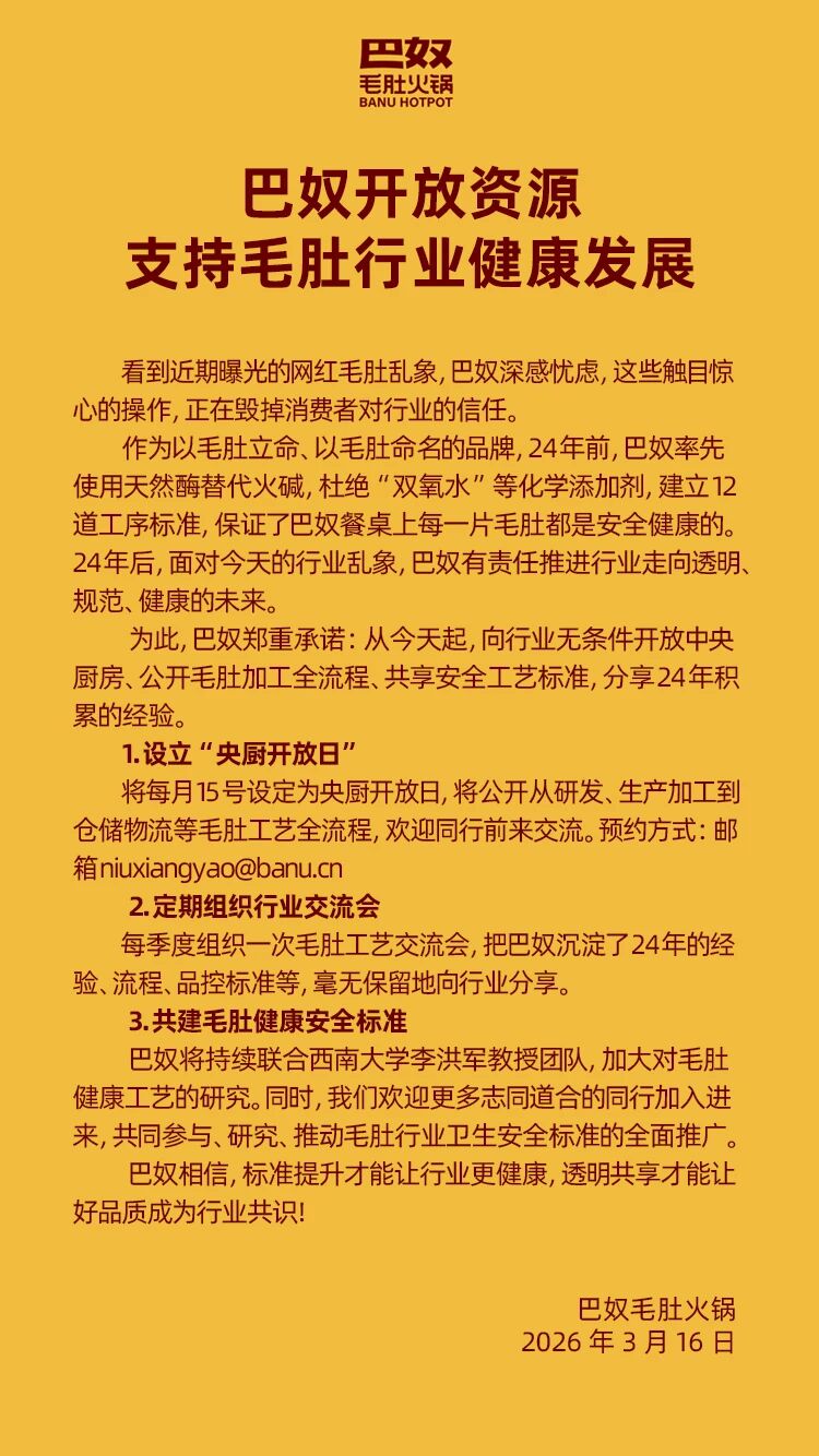 3月16日,巴奴毛肚火锅发文称,从今天起,向行业无条件开放中央厨房、公开毛肚加工全流程、共享安全工艺标准。