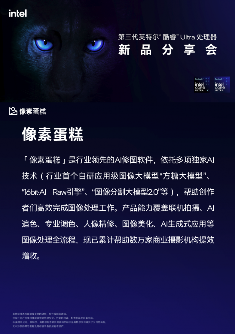 近日,在第三代英特尔® 酷睿™ Ultra处理器新品分享会上,像素蛋糕作为图像软件赛道唯一受邀的专业AI修图应用正式亮相。此次亮相不仅标志着像素蛋糕加入Intel硬件生态,更宣布已完成与Intel最新芯片的优化适配,为全球摄影师及修图师带来了“即拍、即修、即交付”的无缝工作流体验。