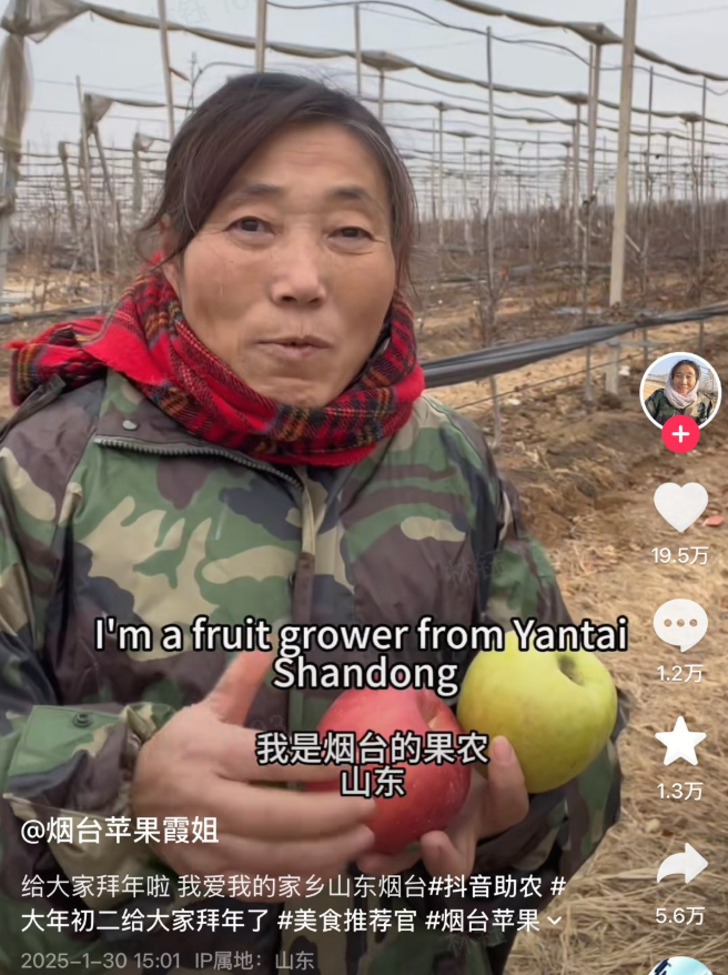 没有美颜的镜头里,她裹着迷彩服、围着红围巾,黝黑的脸庞、皲裂的手指,握着红彤彤的苹果,一口流利的英语“I am a fruit grower from Yantai Shandong”,让天南海北的网友记住了这位朴实又特别的果农。
