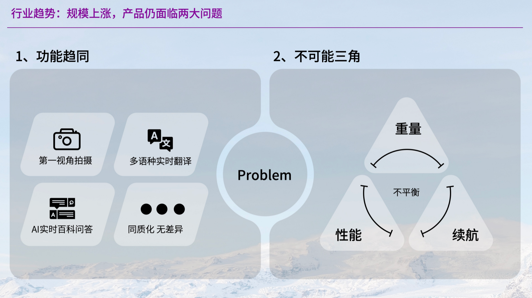 虽然市场目前分化出AI音频、AI拍摄、AI+AR等不同品类,但在品类繁荣的背后,产品功能呈现趋同态势,第一视角拍摄、多语言翻译、AI问答成为多数产品的标配。硬件层面的轻量化、显示效果与成本控制,依然是多数厂商难以兼顾的三角难题。