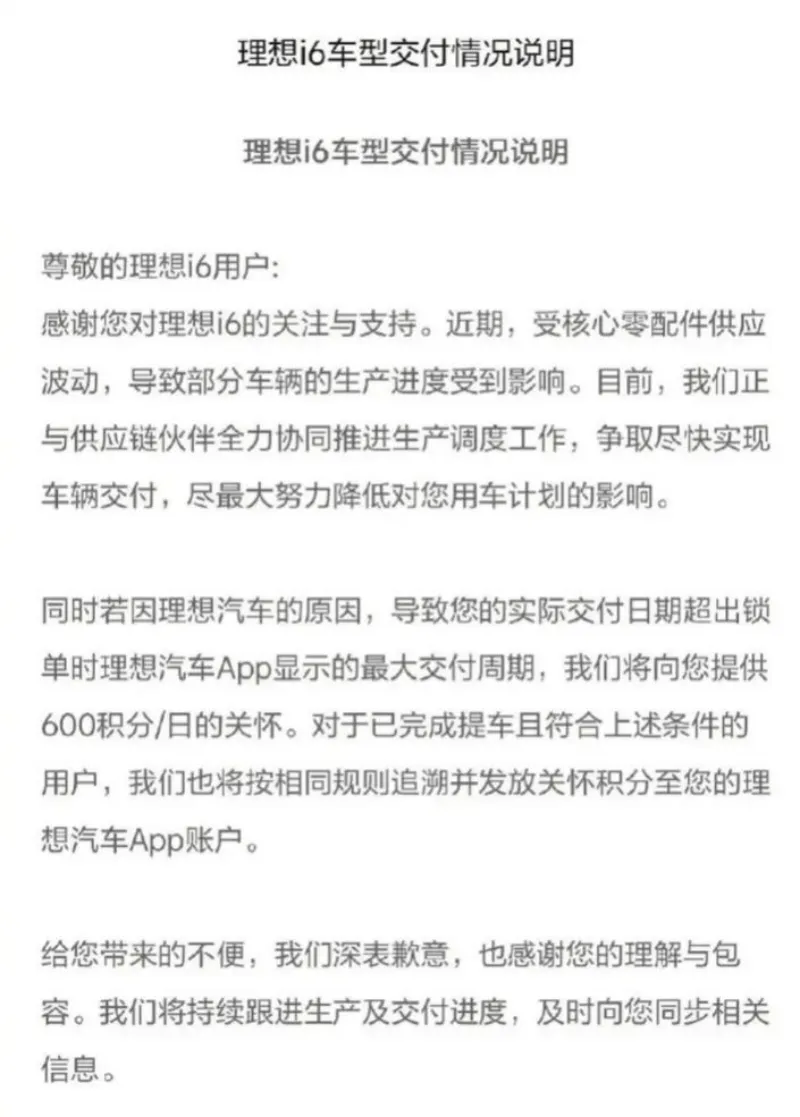 去年,理想i6因电池供应问题出现延迟交付,此事也流传出多个不同版本,有称宁德时代优先满足大客户产能,对理想“卡产能”,也有称理想借此逼用户选择欣旺达电池以实现降本。