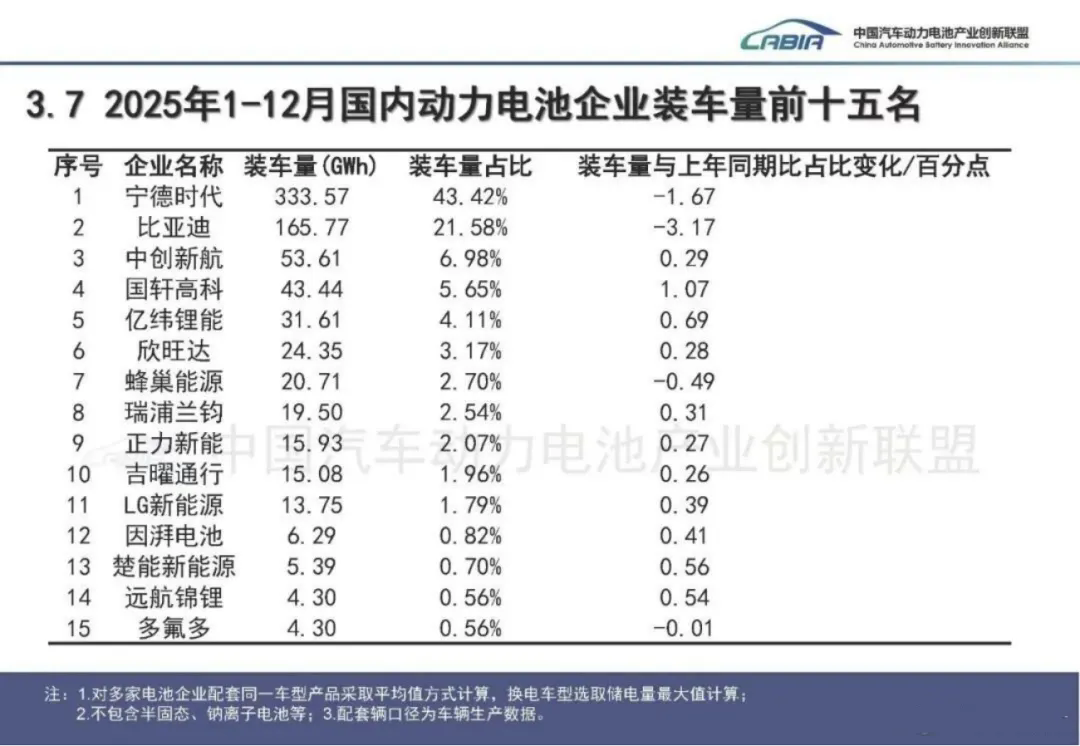 而在当下,国内新能源市场的低增速已成事实,压力终究会传导到宁王身上。在车企纷纷“去宁化”的趋势下,尽管2025年宁德时代在国内的市占率仍居榜首,但较2024年45.09%的市场份额,已下滑1.67个百分点 ,是前十五名中下滑幅度第二大的企业。