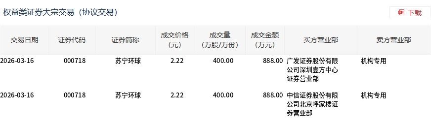 3月16日,苏宁环球大宗交易成交800万股,成交额1776万元,占当日总成交额的21.37%,成交价2.22元,较市场收盘价2.29元折价3.06%。