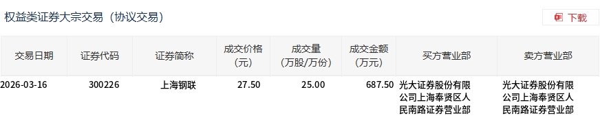 3月16日,上海钢联大宗交易成交25万股,成交额687.5万元,占当日总成交额的2.39%,成交价27.5元,较市场收盘价27.31元溢价0.7%。