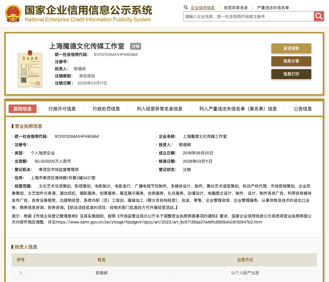 国家企业信用信息公示系统网站显示,2026年3月11日,上海魔德文化传媒工作室登记状态由存续变更为注销,注销原因为其他原因。