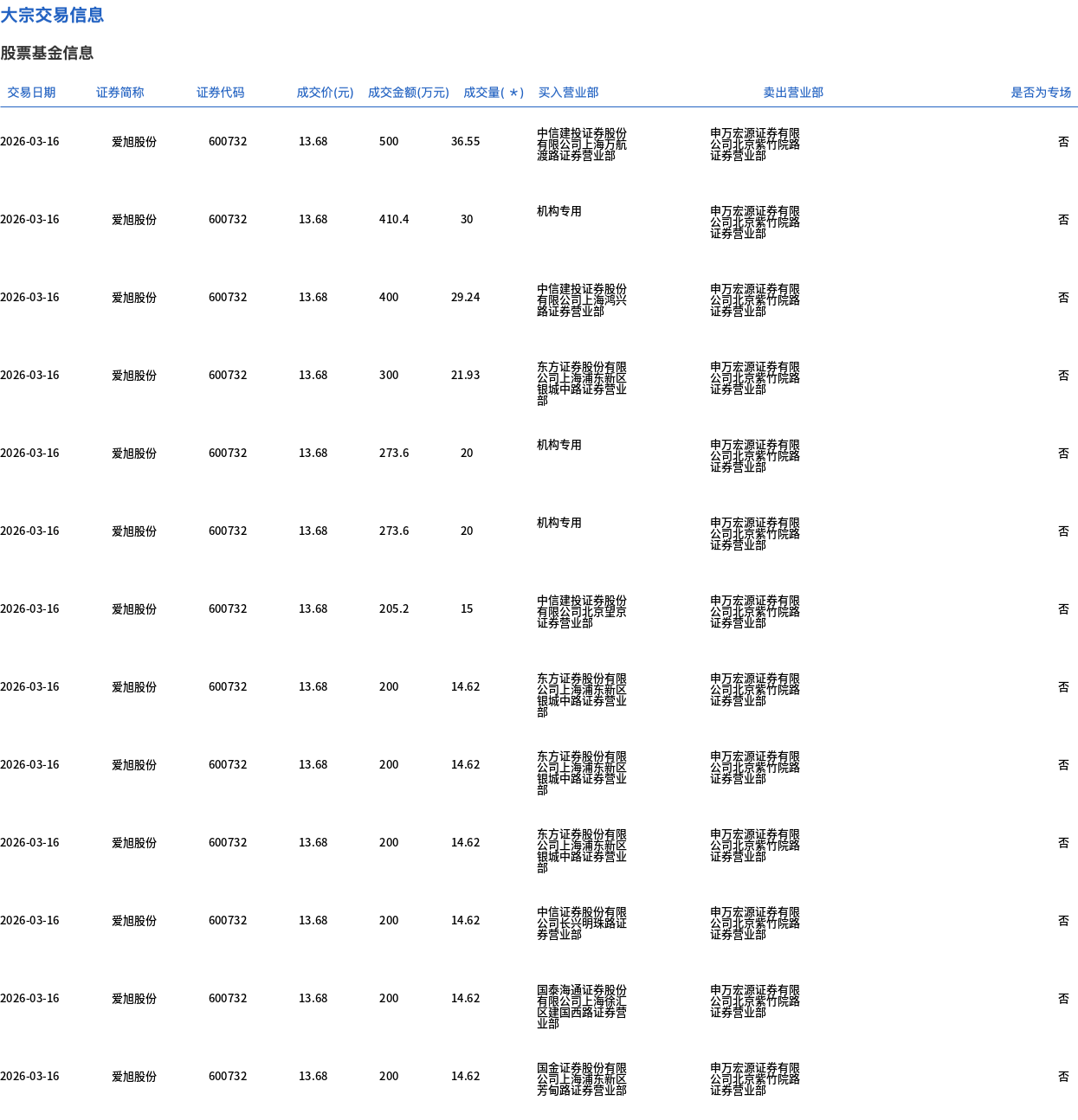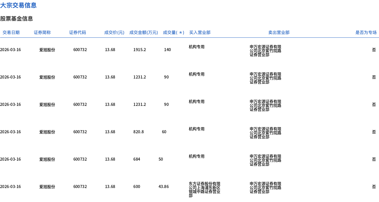 3月16日,爱旭股份大宗交易成交734.3万股,成交额1亿元,占当日总成交额的14.67%,成交价13.68元,较市场收盘价14.88元折价8.06%。