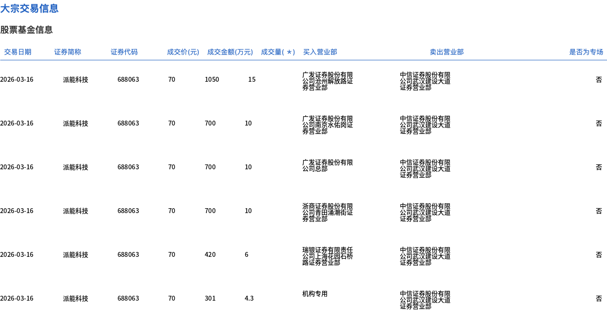 3月16日,派能科技大宗交易成交55.3万股,成交额3871万元,占当日总成交额的2.99%,成交价70元,较市场收盘价76.85元折价8.91%。