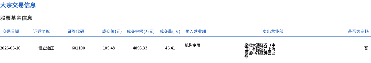 3月16日,恒立液压大宗交易成交46.41万股,成交额4895.33万元,占当日总成交额的6.87%,成交价105.48元,较市场收盘价105.48元持平。