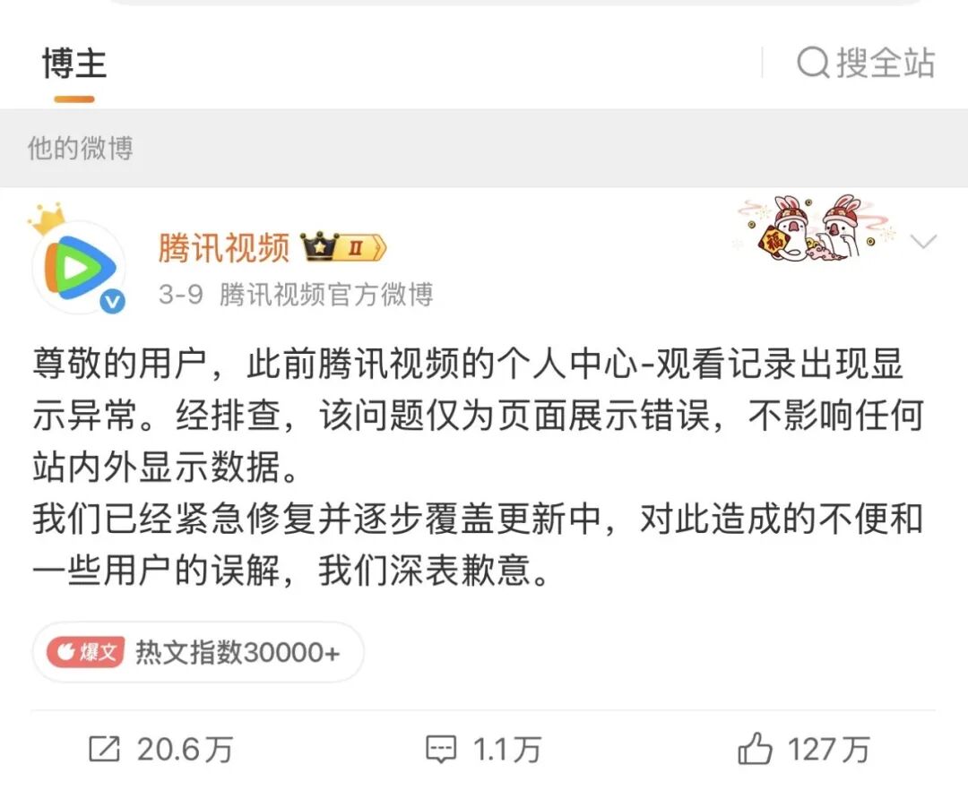 有用户反馈,仅观看了几秒广告,系统便显示已看完全集;也有用户表示,自己从未主动观看该剧,账号却莫名出现相关观看记录。对此,腾讯视频迅速回应,称上述问题仅为页面展示故障,不影响站内外任何公开数据的统计,且已完成紧急修复并逐步推送更新,但这一回应仍未平息部分网友对平台热度值计算机制的质疑。