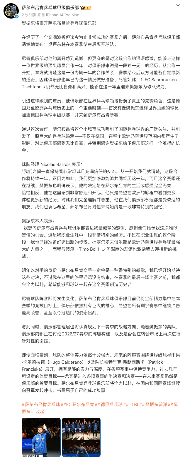 3月16日,萨尔布吕肯乒乓球俱乐部宣布:樊振东将在本赛季结束后离开球队。同时,俱乐部管理层也将认真规划下一赛季的战略方向。随着樊振东的离队,俱乐部内部正在讨论2026/27赛季的阵容构建,以及是否会在转会市场上再次进行针对性的引援。