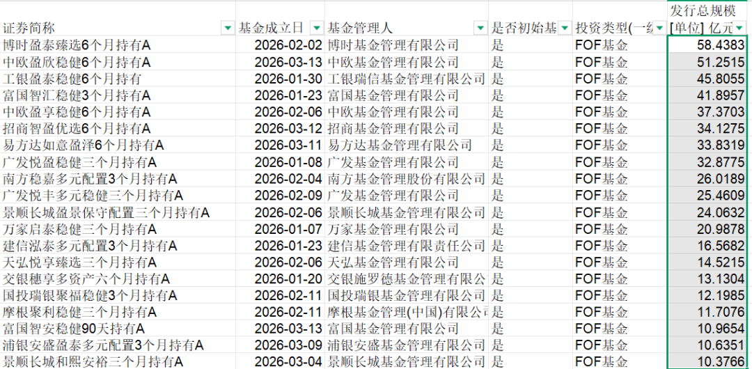 wind数据显示,2026年开年以来,至少已有超过10只FOF实现一日售罄。以最新案例看,中欧盈欣稳健6个月持有混合新发规模51.25亿元,暂列今年以来第二只新发规模超过50亿元的FOF产品。博时盈泰臻选6个月持有A暂列FOF发行规模榜首,新发规模为58.44亿元。