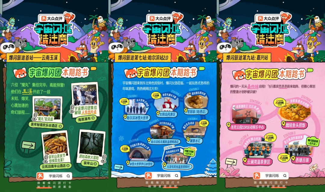 在《宇宙闪烁请注意》中,大众点评也实现了对旅行场景的深度融入,嘉宾会根据大众点评任务探索城市,去网友推荐的餐馆吃饭,去必玩榜上的地点打卡。大众点评在站内同步上线了“跟着爆闪团去打卡”活动页面,详细展示节目同款旅游路线,让观众可以轻松实现“线下打卡同款”的心愿。